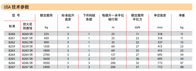 ·防火花和防腐蝕選項——包括合金鋼吊鉤、鍍鎳不銹鋼起重鏈條和鋁制或銅質(zhì)手拉鏈條。
